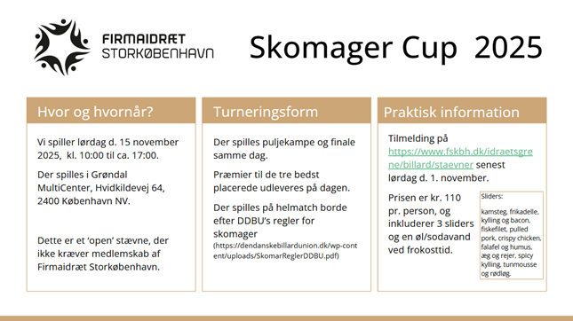 Alle med interesse for skomager-billard er velkomne til at deltage i Firmaidræt Storkøbenhavns stævne den 15. november 2025 i Grøndal MultiCenter. Vi spiller skomager fra kl. 10 til ca. 17, og spiser en hyggelig frokost midt på dagen.