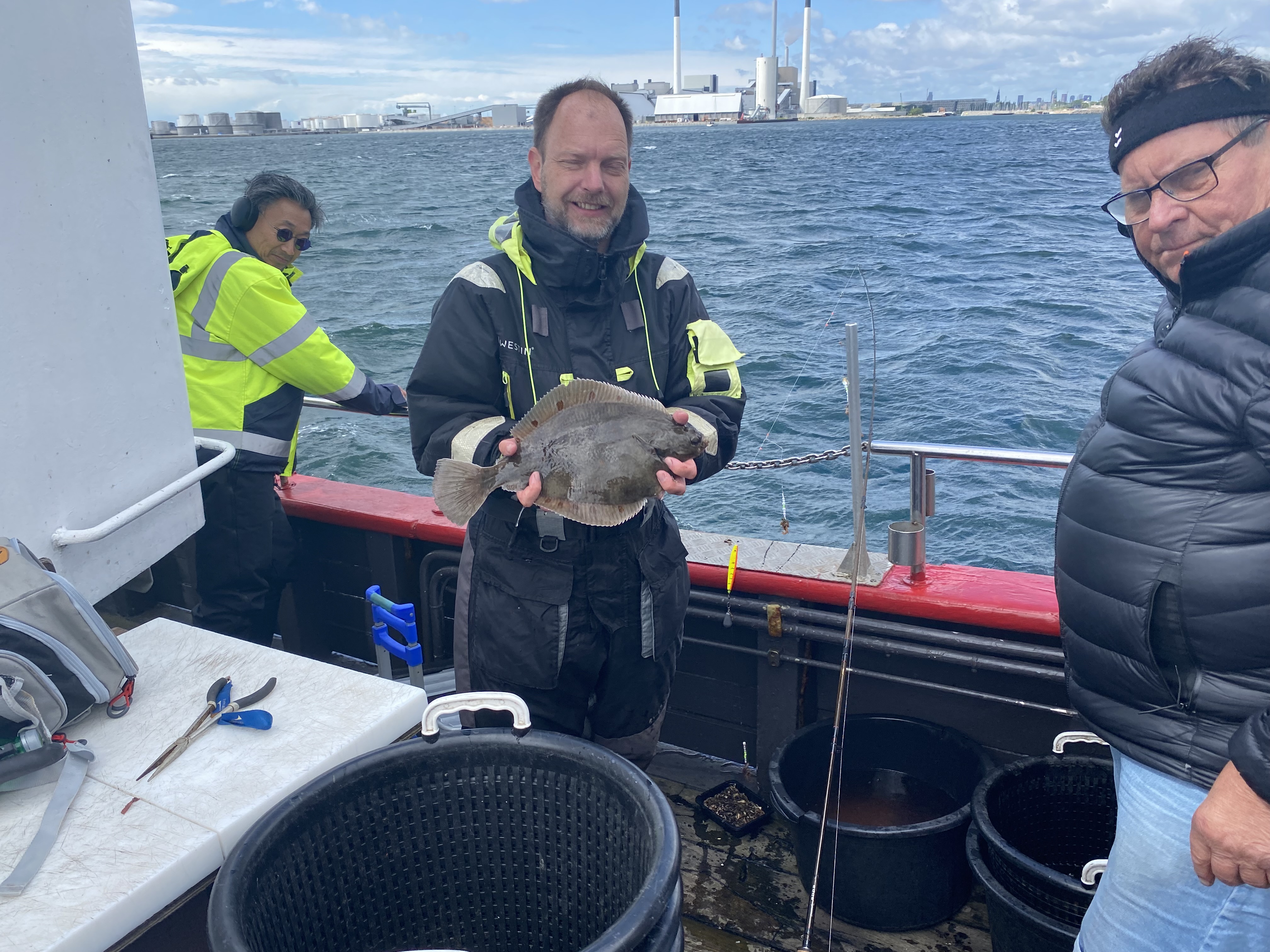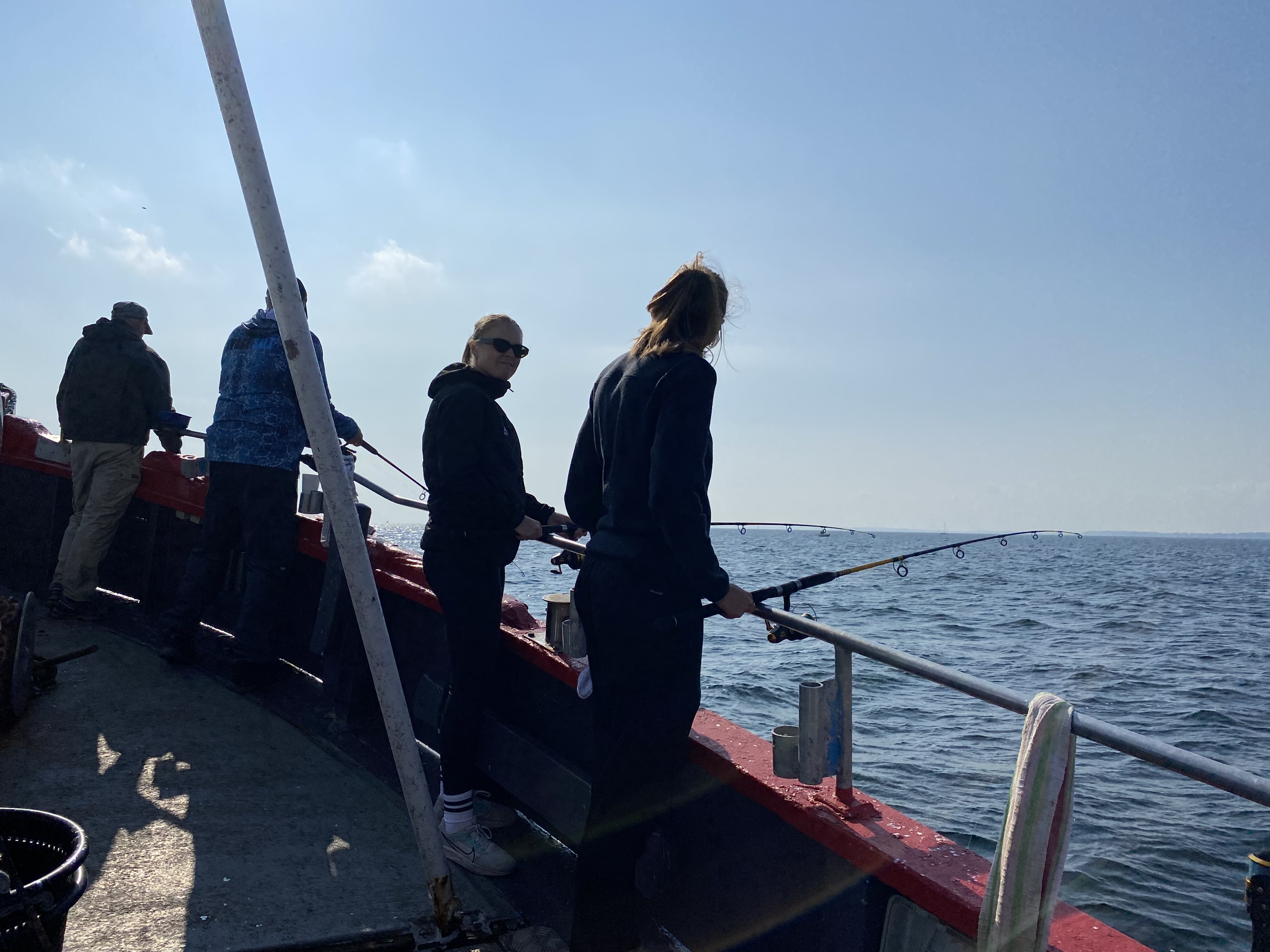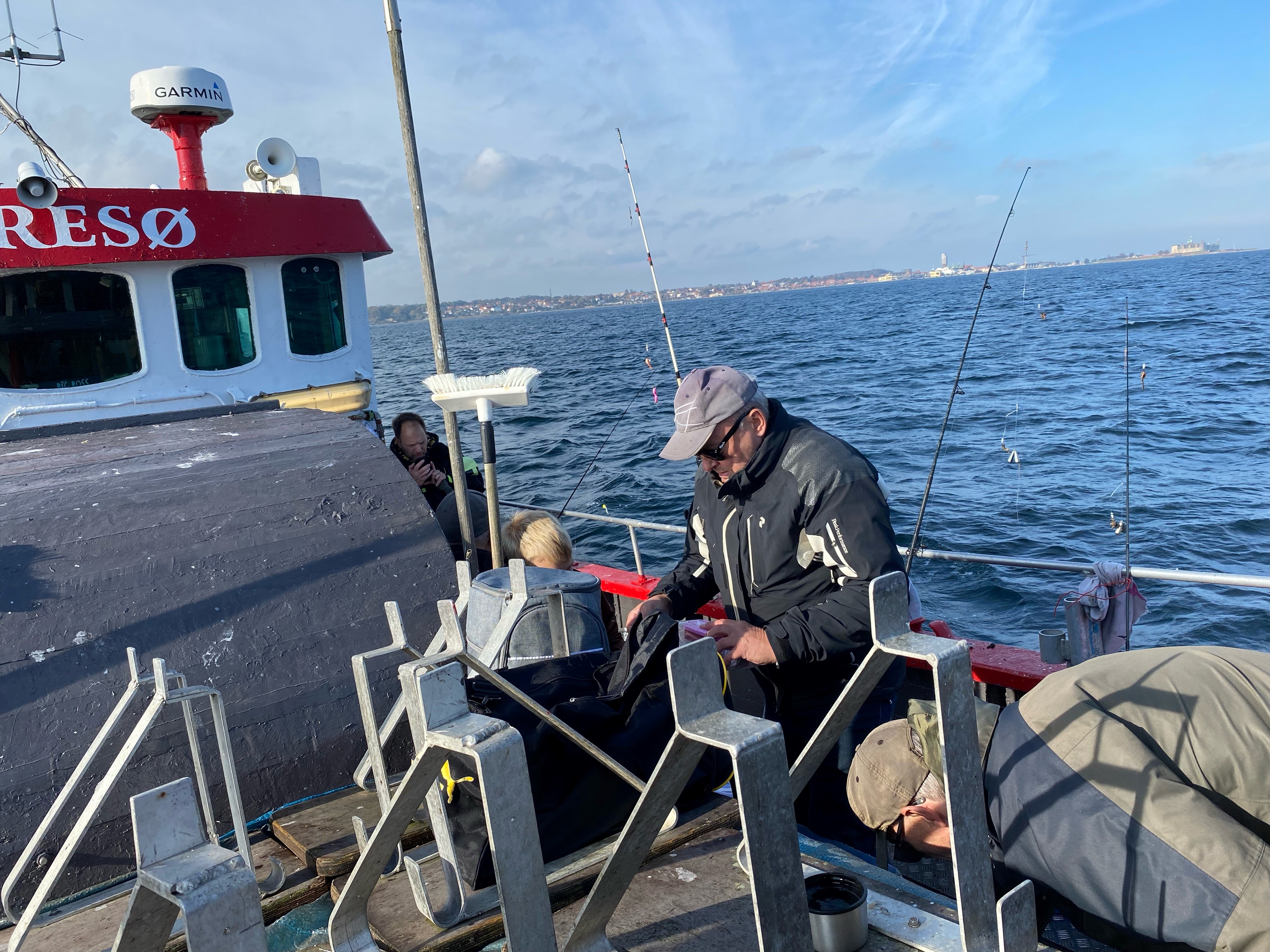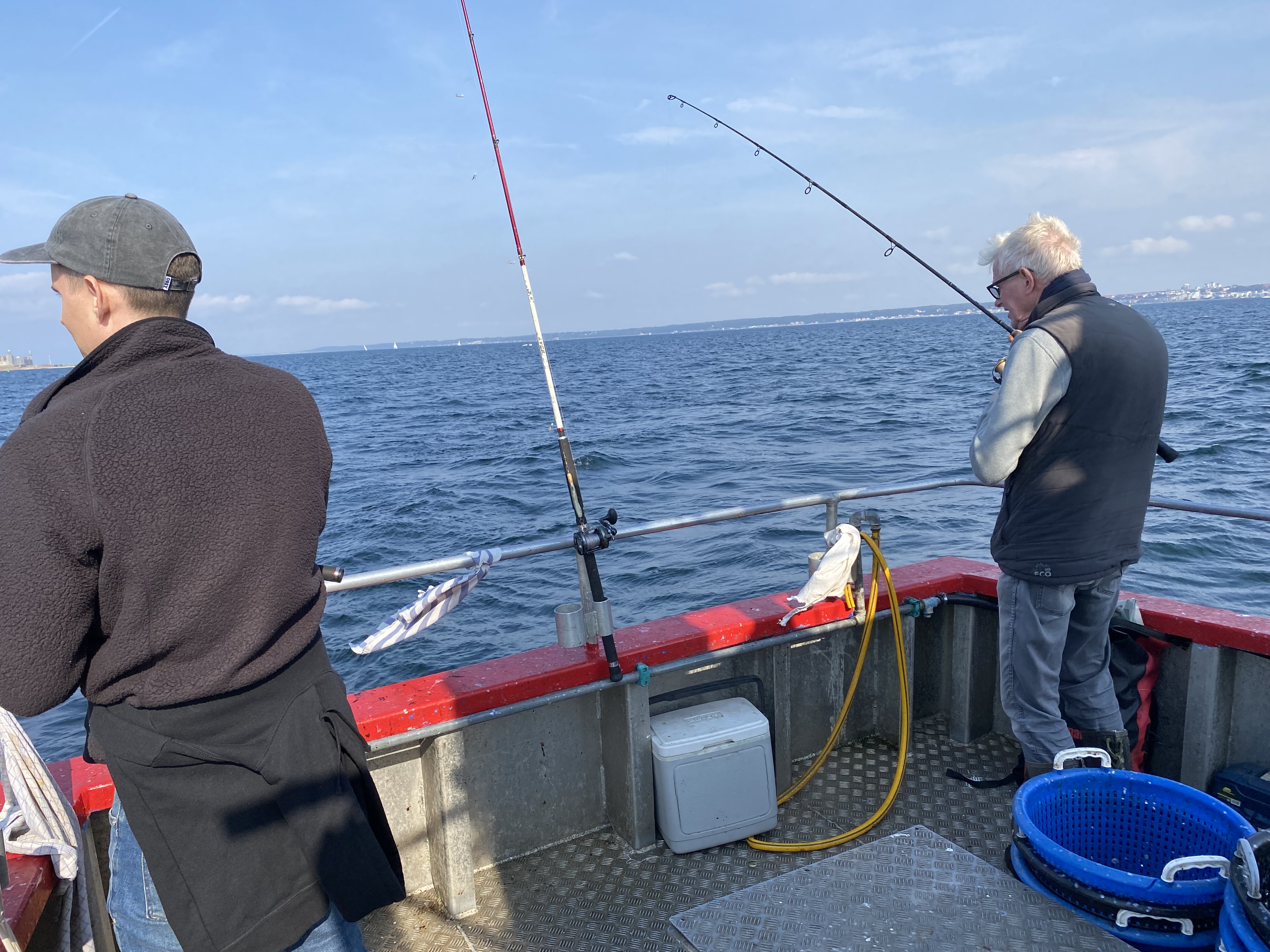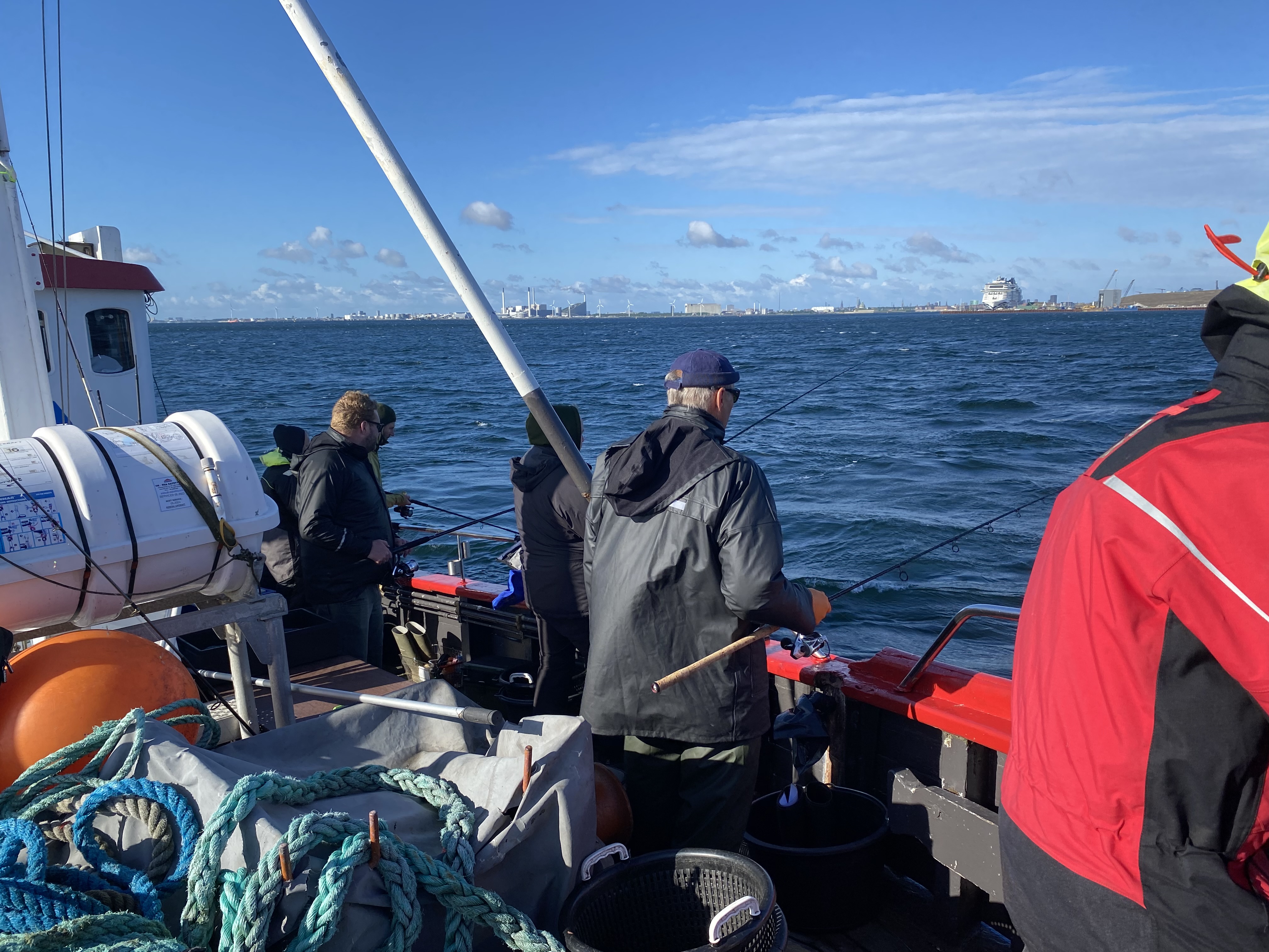 Fremme på fiskepladserne holdt skipper båden så alle kunne få snøren på bunden. Selvom Øresund lå badet i sol og næsten ingen vind rørte sig, var der en rivende strøm, og den blev der kompenseret for med motorkraft af skipperså alle fik et relativt problemfrit fiskeri.