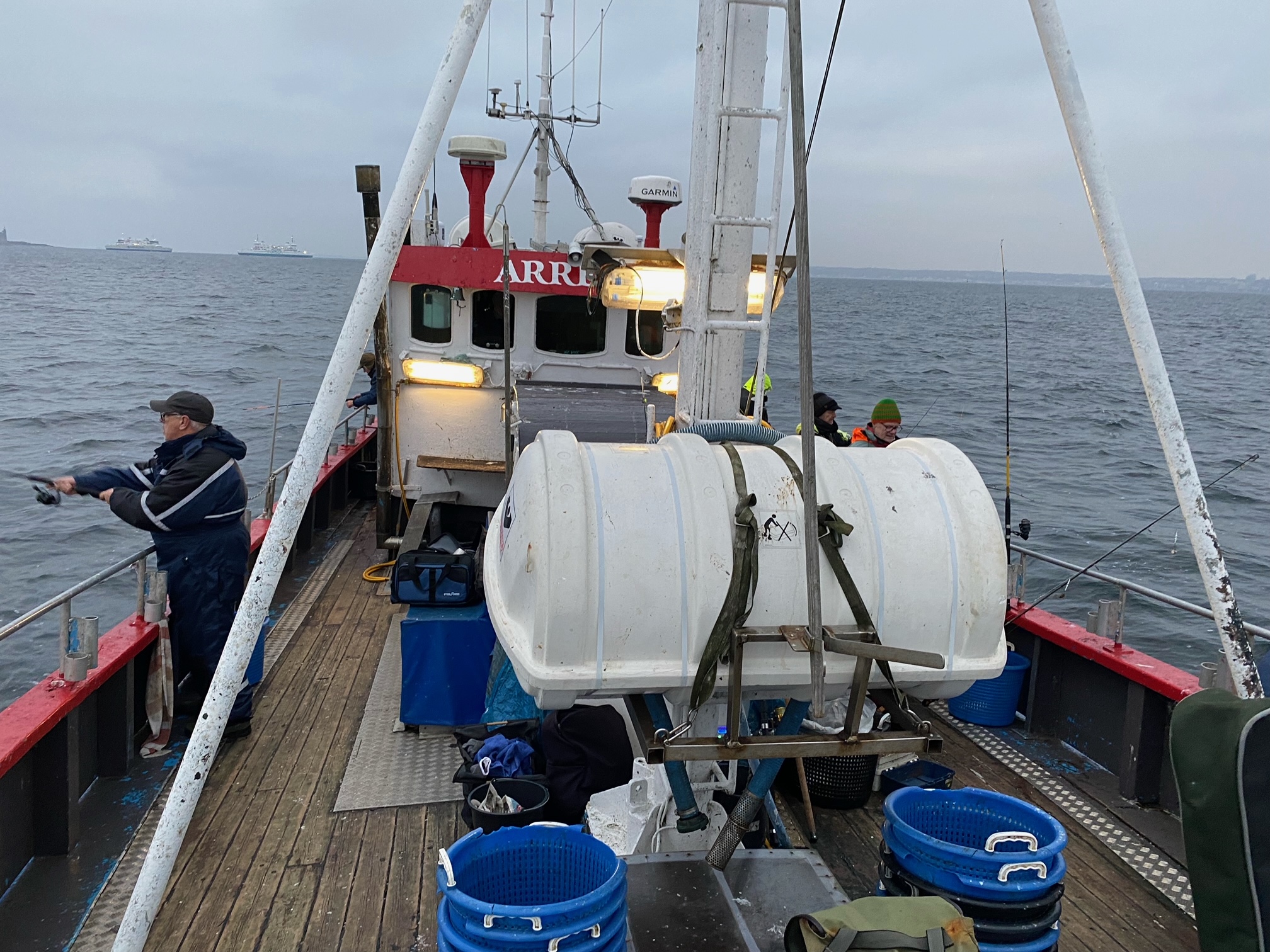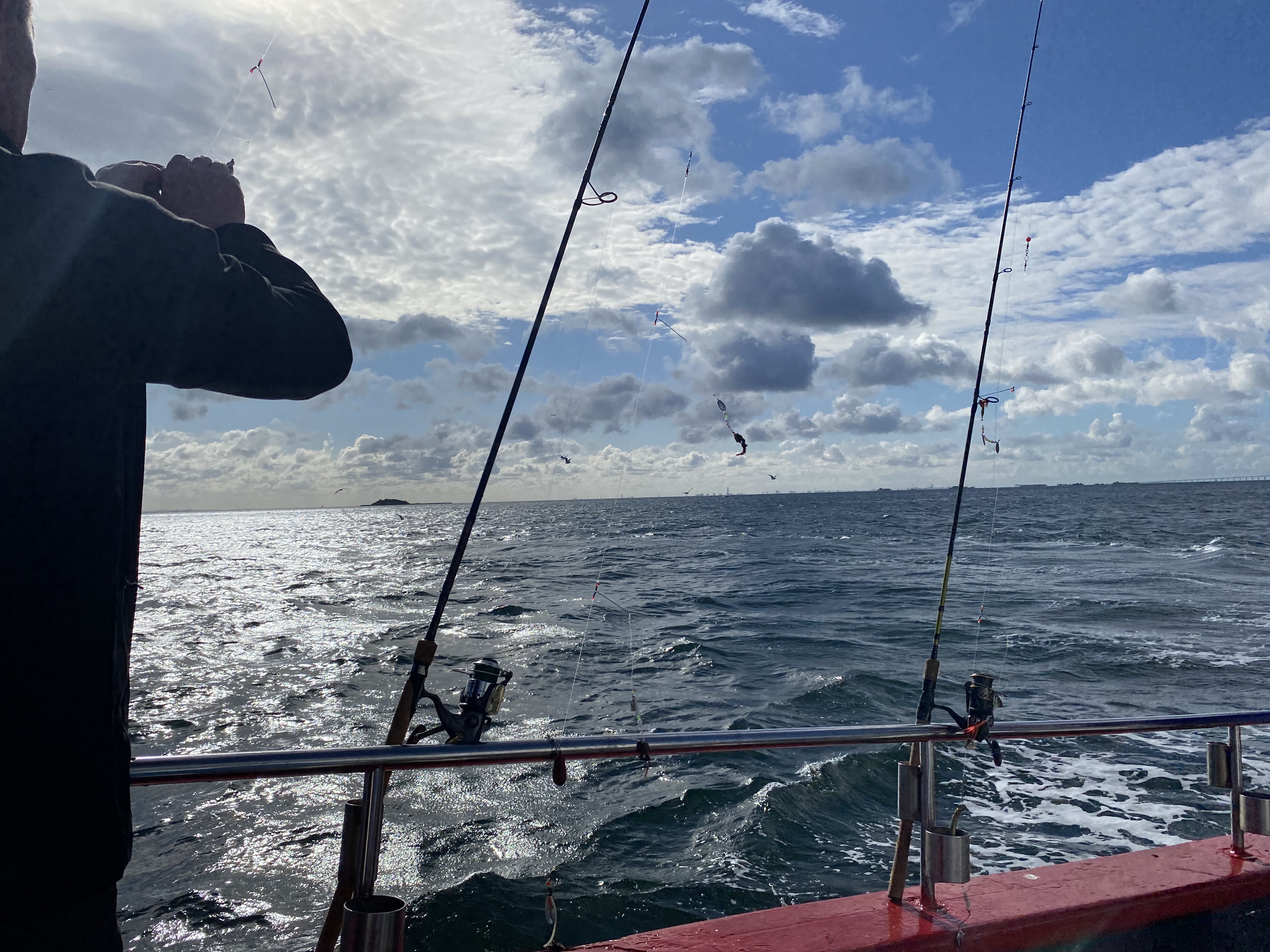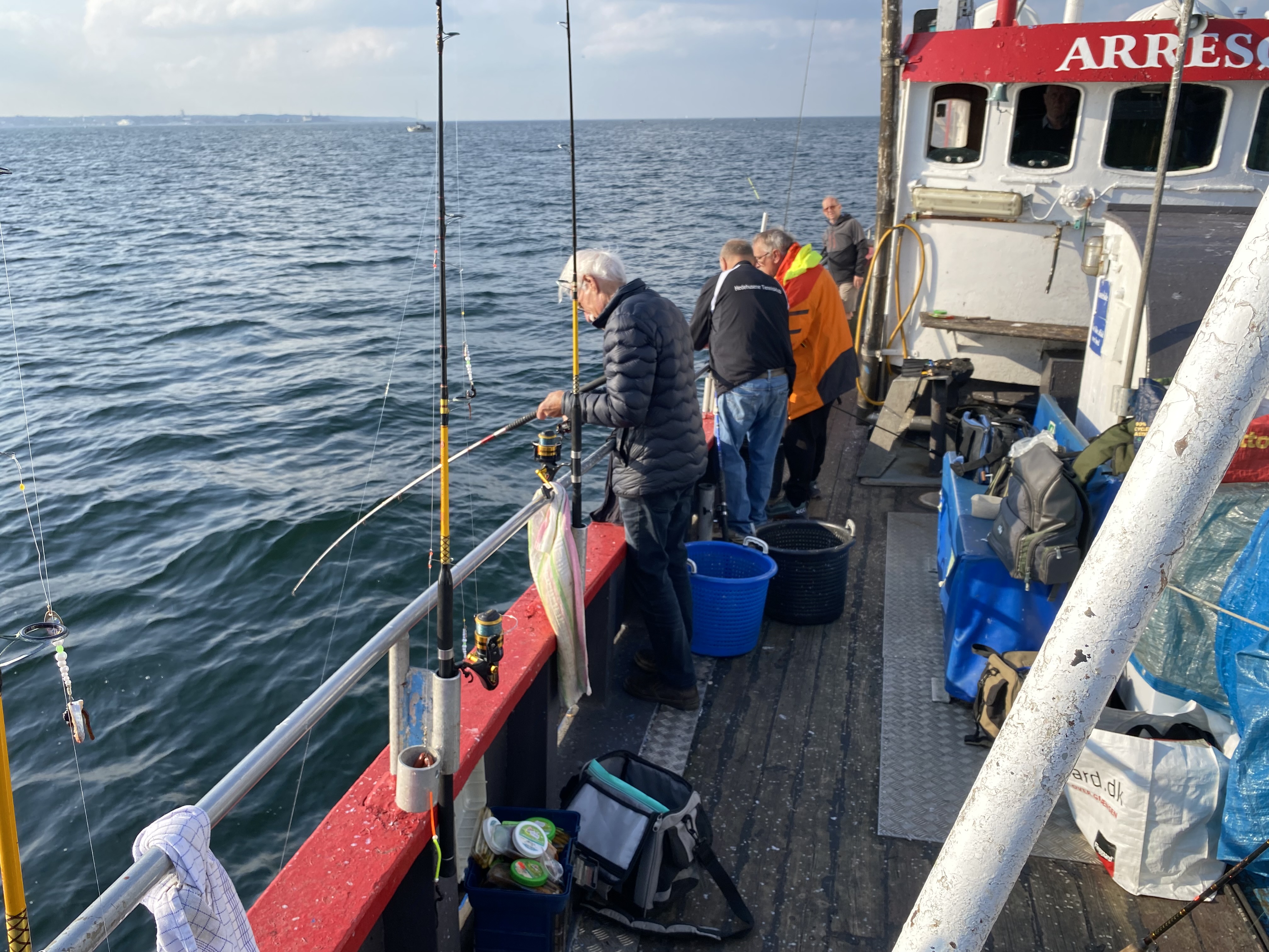 Vi mødtes på havnen hvor Arresø lå klar til at sejle ud med 15 glade fiskere. Vinden var svær og der gik en lidt kraftig strøm som gjorde fiskeriet lidt besværligt og vi startede ved svenskekysten ud for Helsingborg. Det var småt med fisk og de hvillinger der kom op manglede størrelse og isingerne var i frimærkestørrelse.