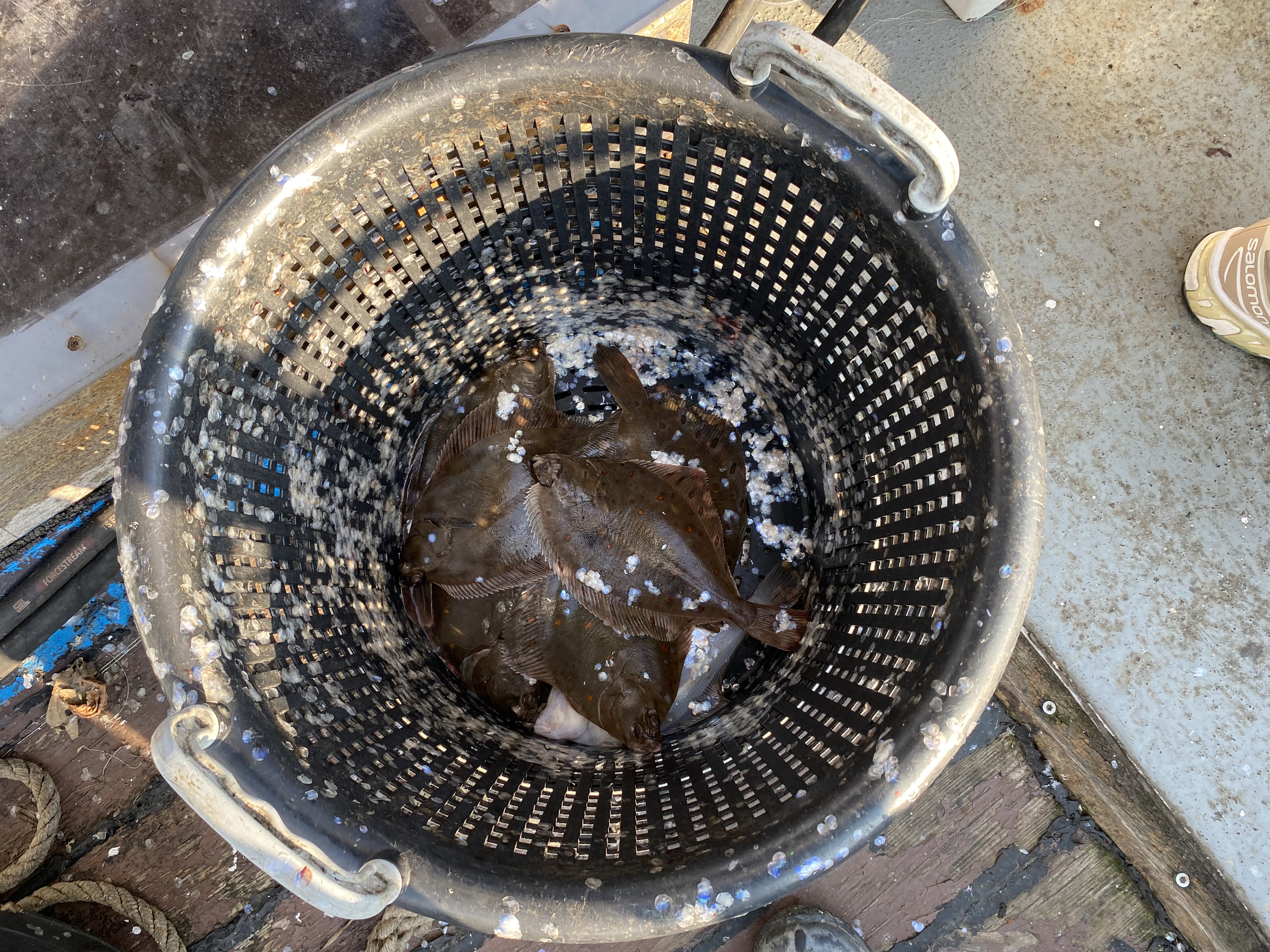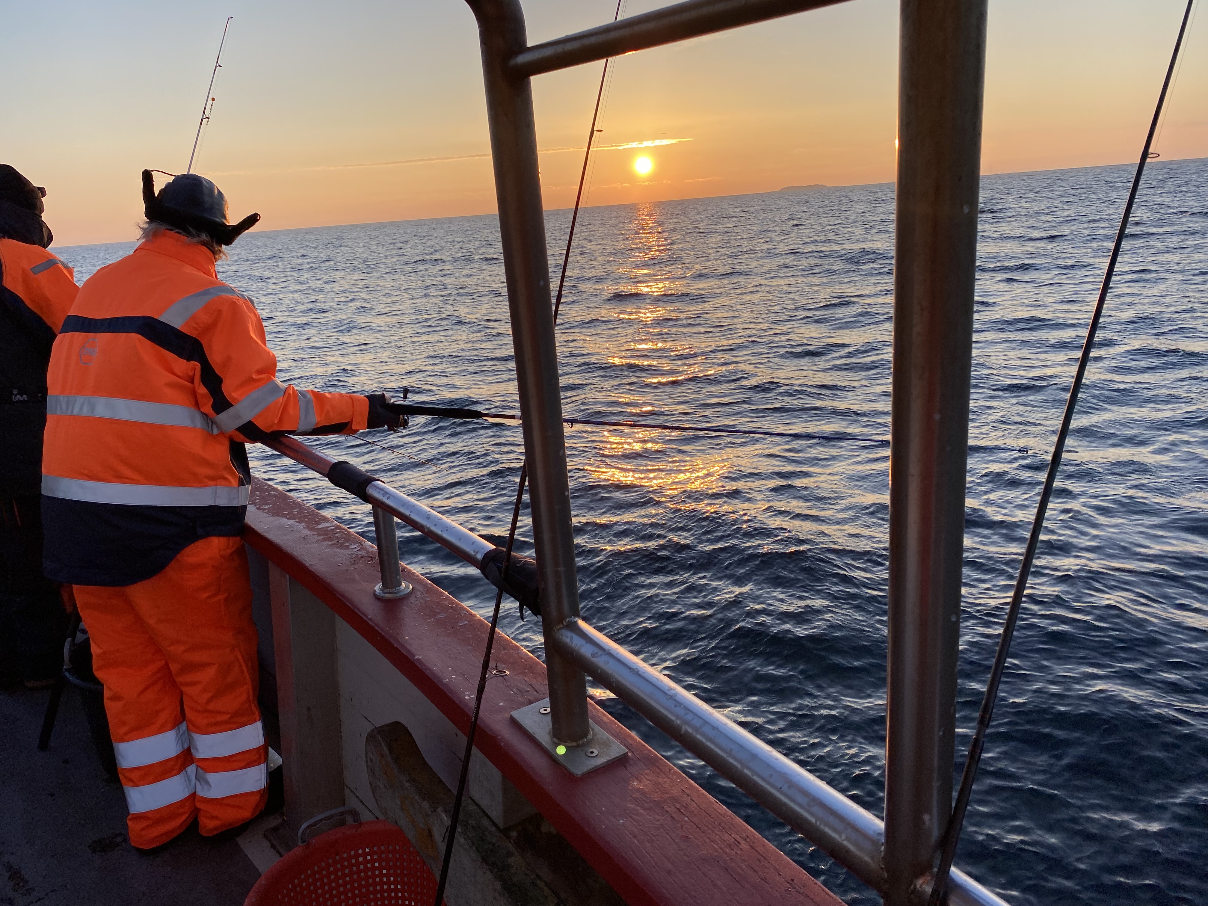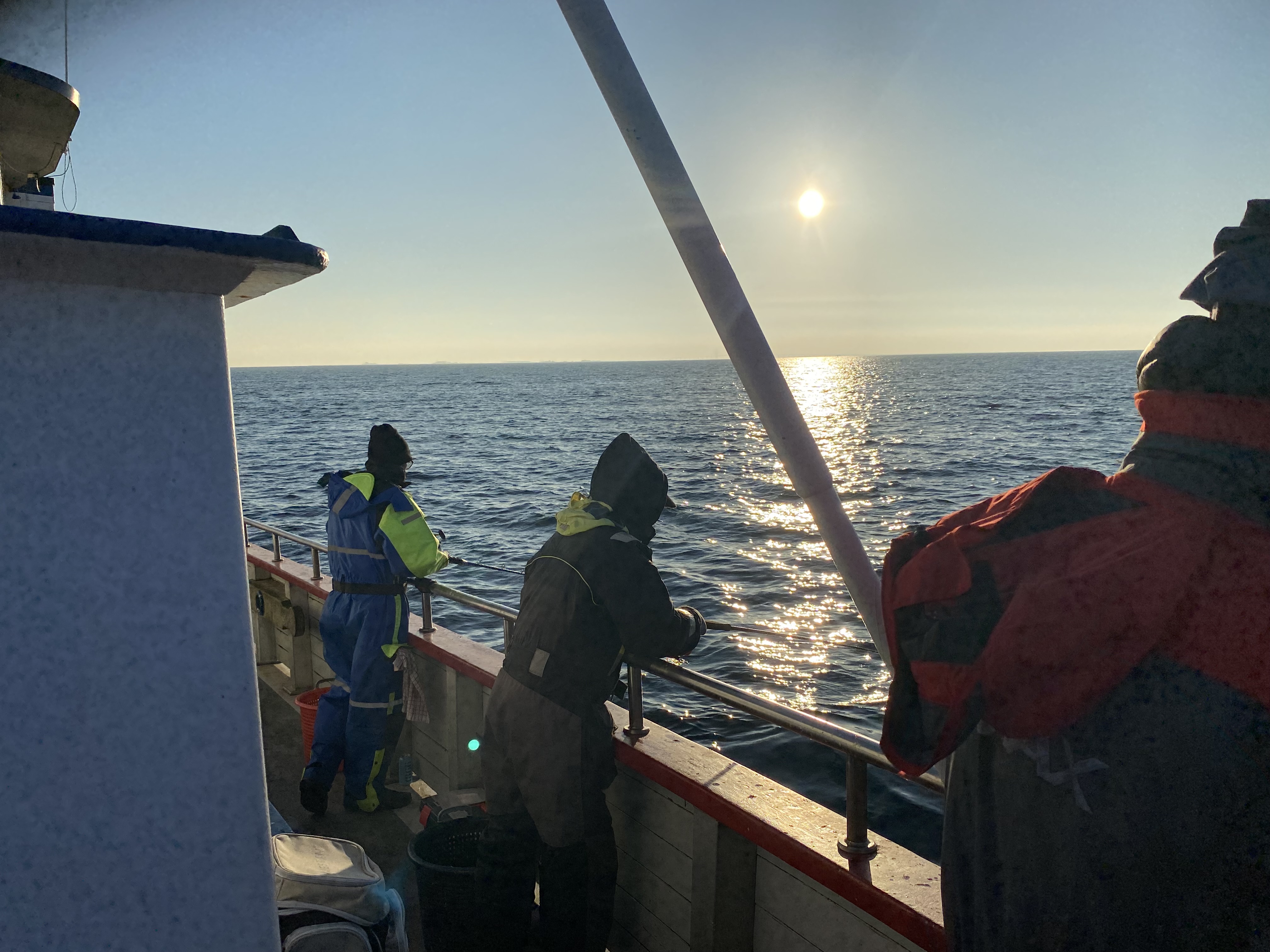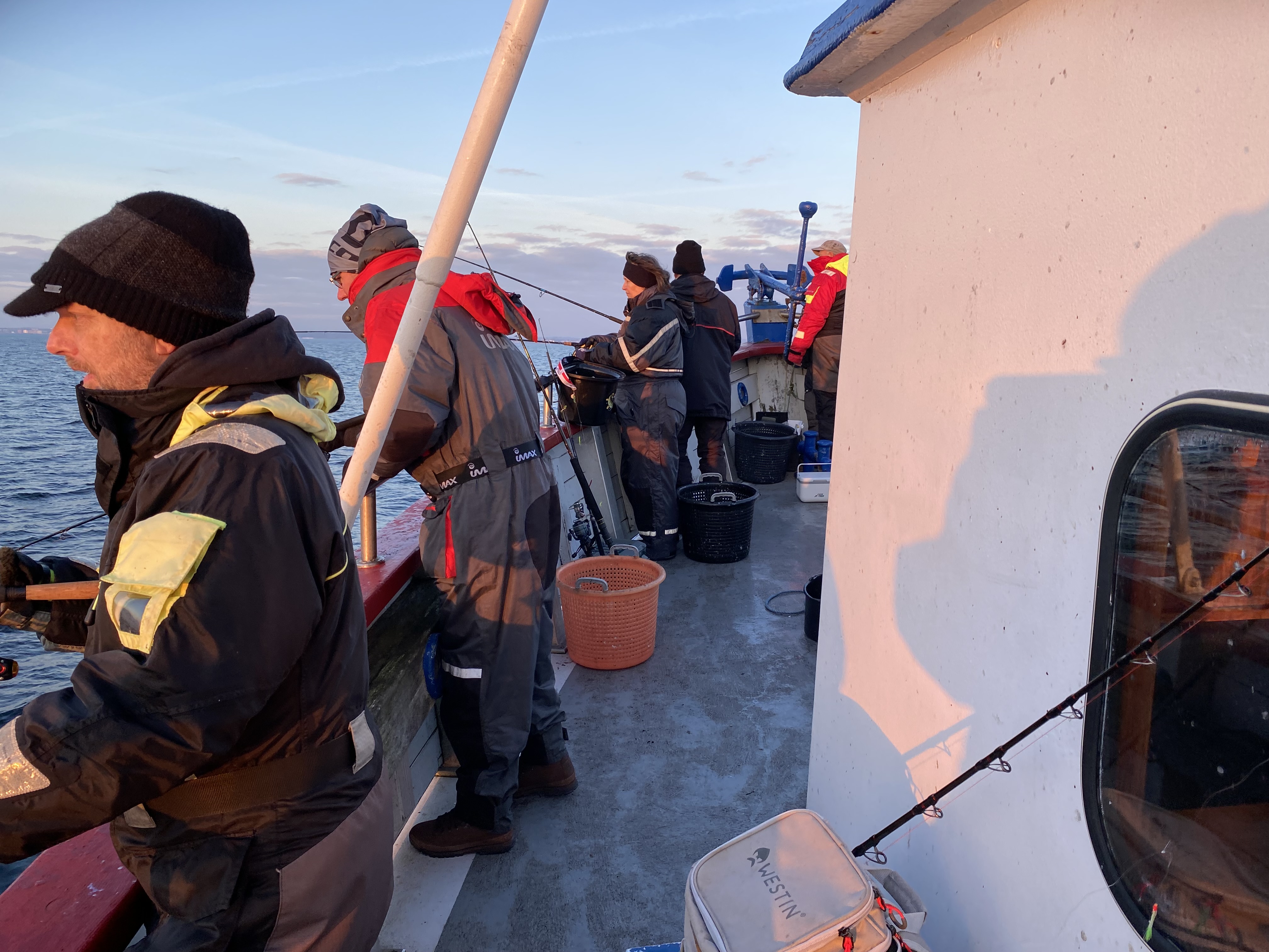 Ude på sundet skulle vi i tusmørket forsøge at finde lidt flade og hvilling. Efterhånden som solen begyndte at vise sit smukke ansigt, kom temperaturerne også op i et mere fingervenligt område og der kom lidt endorfiner i kroppen og der kom også fisk på dækket.