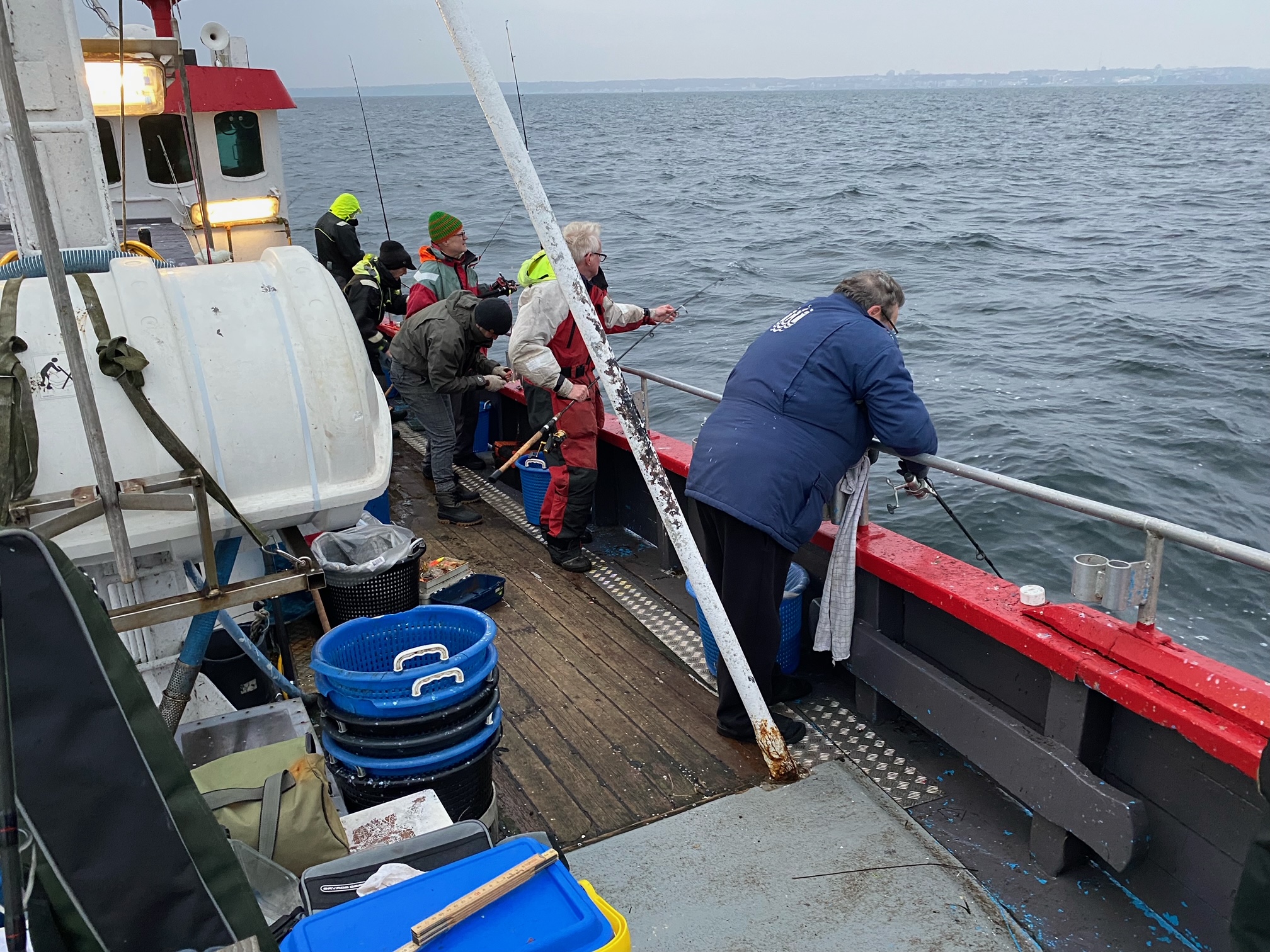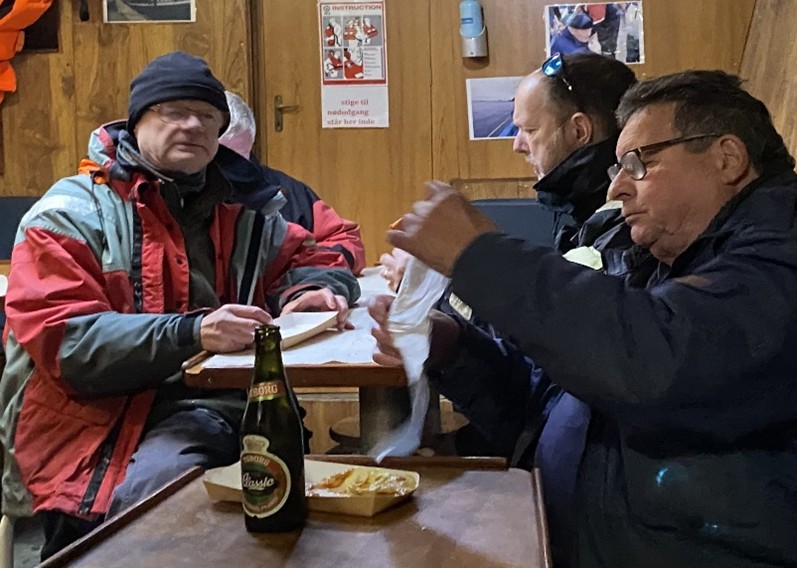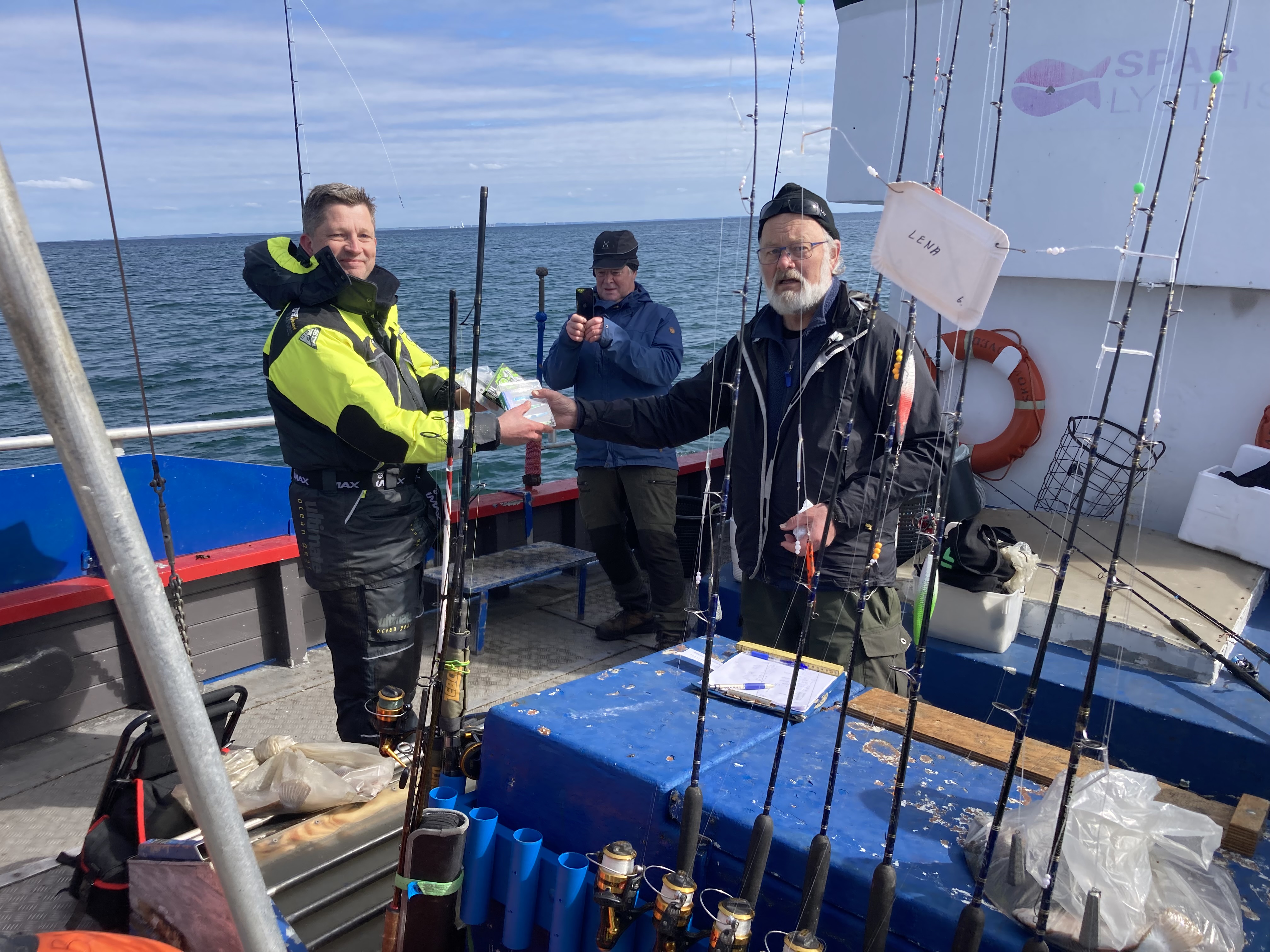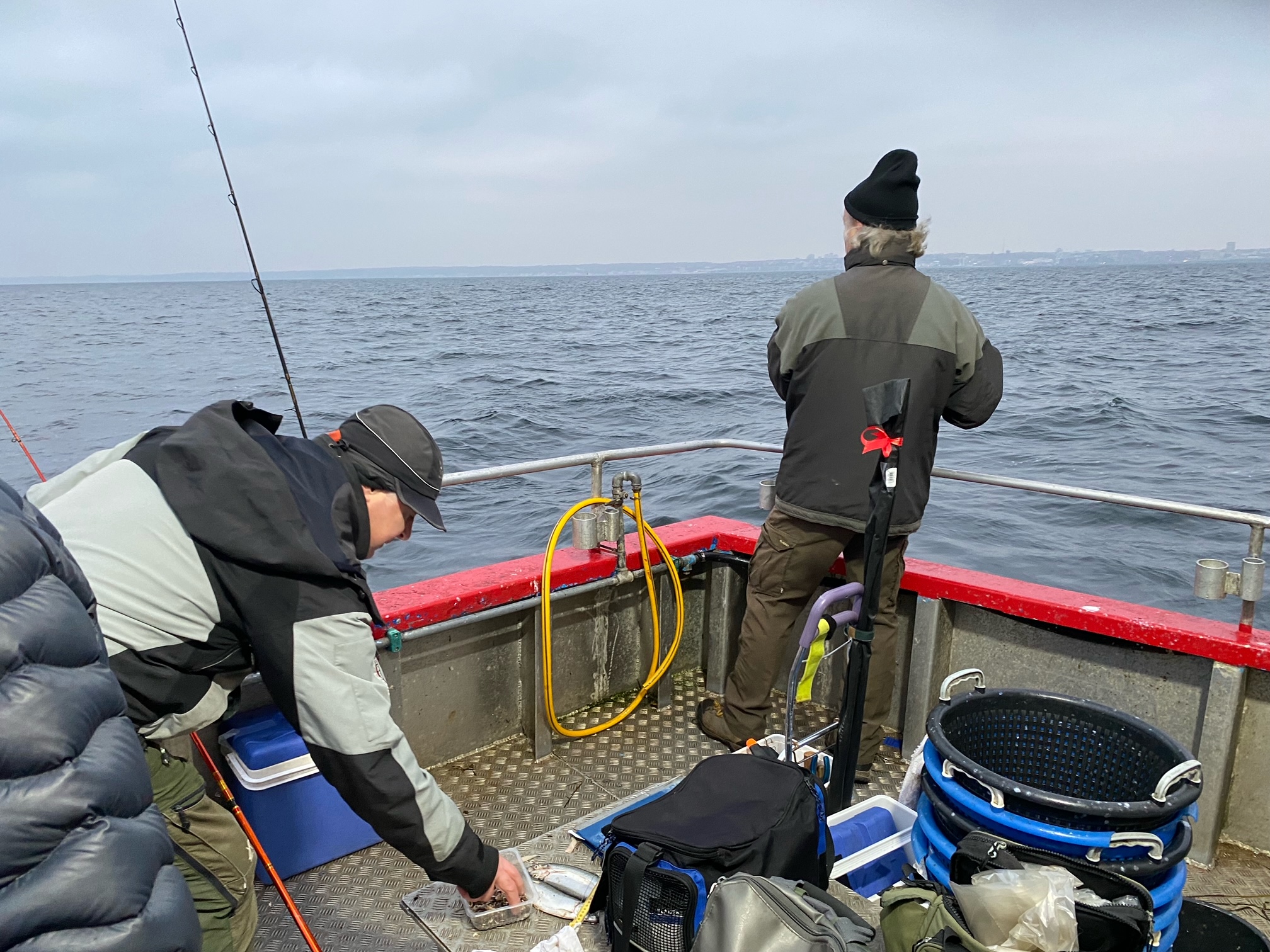 Alle blev ombord og forsøgte ihærdigt at gøre spådommen til skamme. Vi fiskede, delte hinandens gode humør og en kop varm kaffe. Kaffen stod godt til de 10 meter forårsvind, men fisk gav den jo ikke.